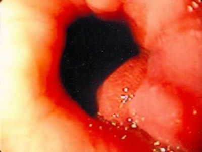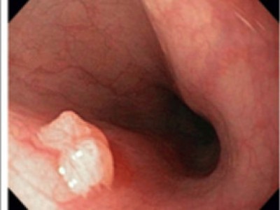 Lesion: Endoscopic view of an esophageal inflammatory polyp-fold complex in an 8-year-old with recalcitrant gastroesophageal reflux