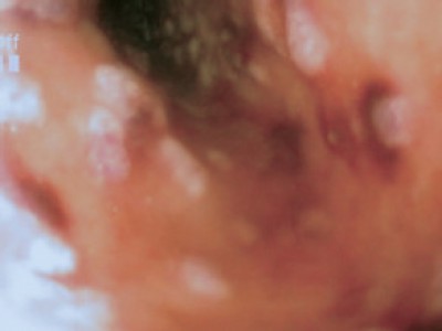 Type 1: The middle and lower thirds of the esophagus: Small, punched-out lesions with raised margins; a slightly yellowish color and fibrin exudation at the center of lesions