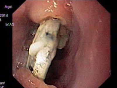 Lesion: The boy 2-year old had a 2cm diameter bouton battery at the upper one-third of esophagus with ulcers, about 2cm from upper esophageal sphincter